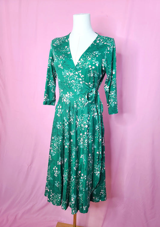 Audrey Wrap Dress in Green Floral Knit by Wax Poetic Clothing
